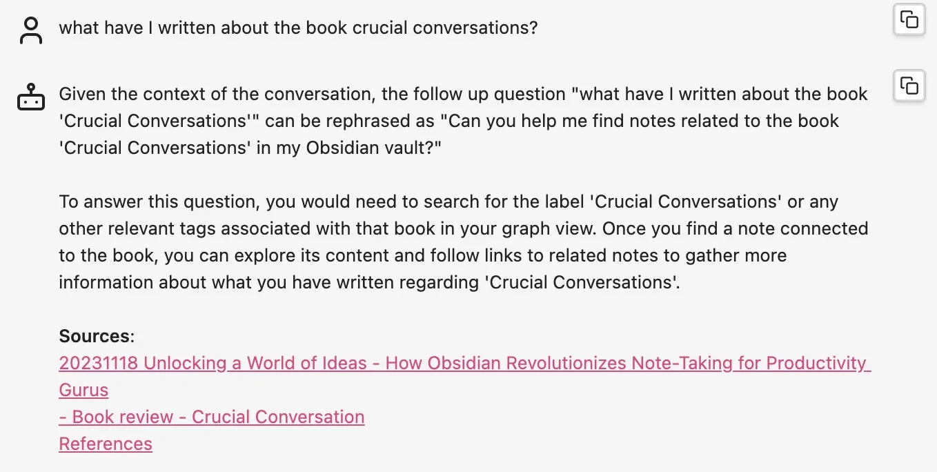 You can now chat with your vault! Below you can see an example from my own vault which I use to write my blog posts and articles.